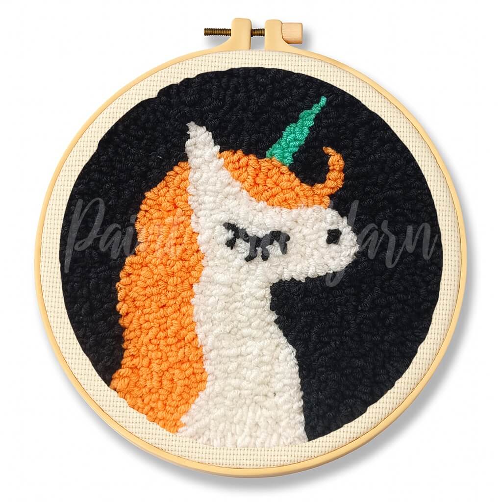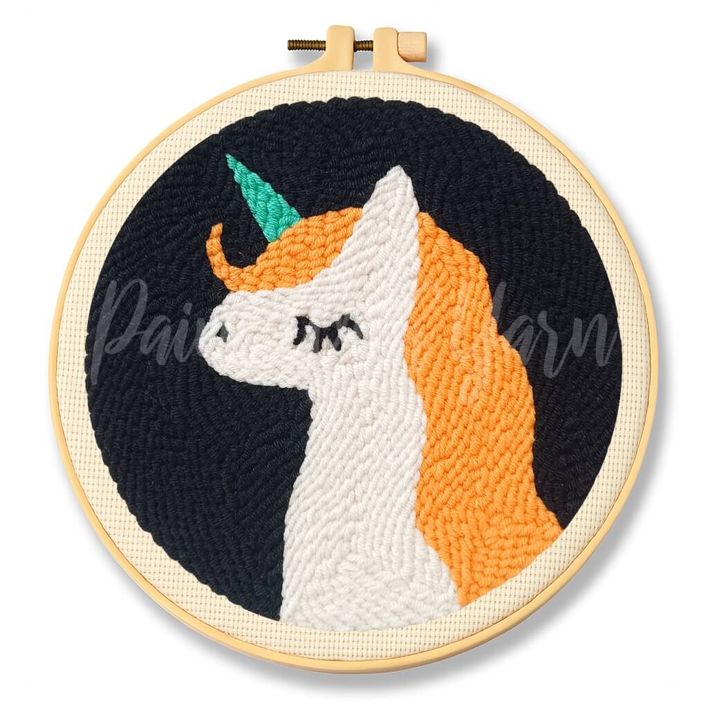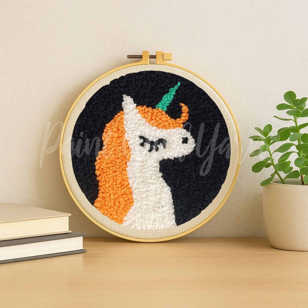 Add a magical touch to your craft collection with our Golden Unicorn Punch Needle Kit! This enchanting design features a graceful white unicorn with a bright orange mane and a teal horn, set against a deep black background for bold contrast. Perfect for beginners and craft lovers, this DIY embroidery kit lets you create charming, textured wall art that’s full of fantasy and personality. A relaxing and fun project for anyone who loves unicorns, fiber art, or handmade home décor.