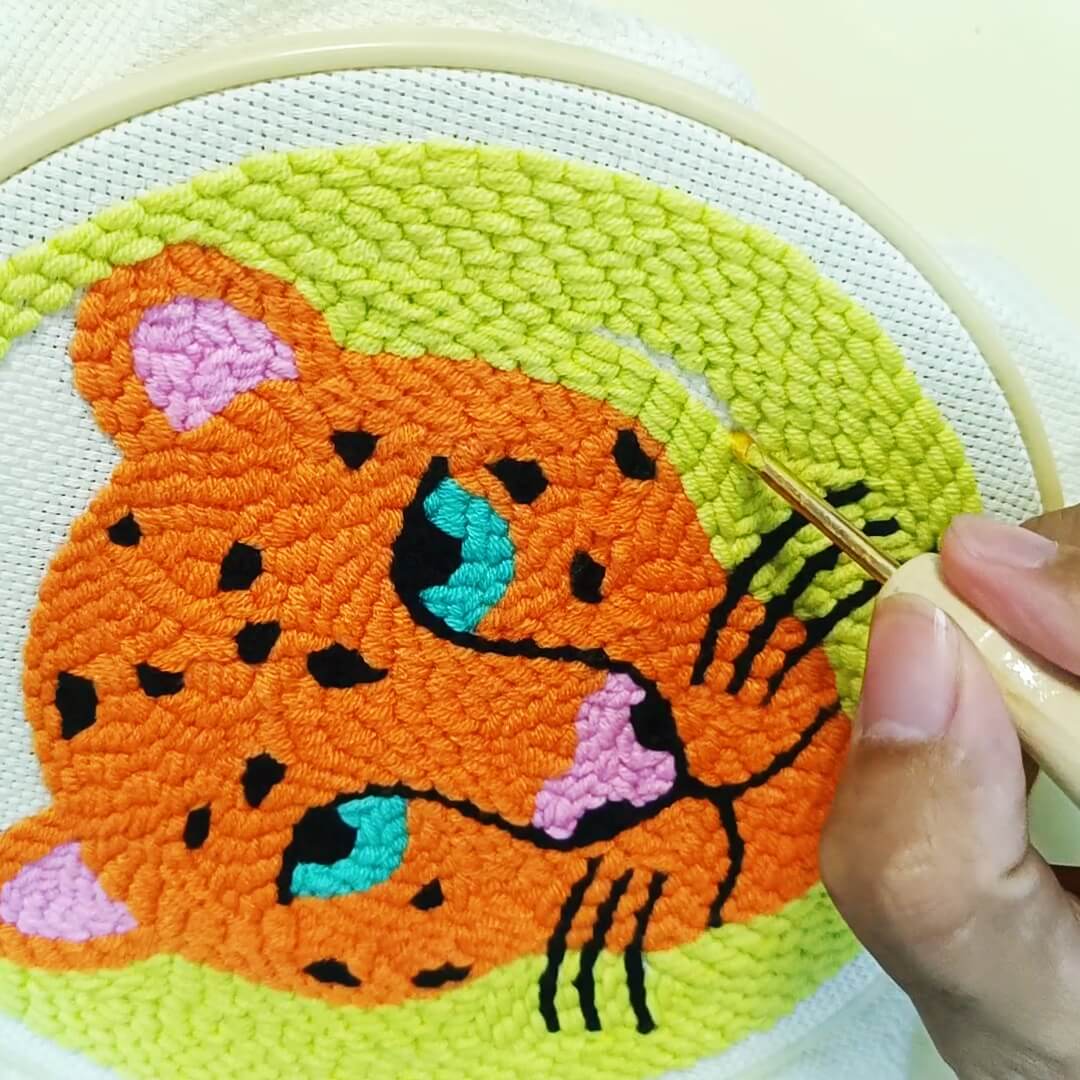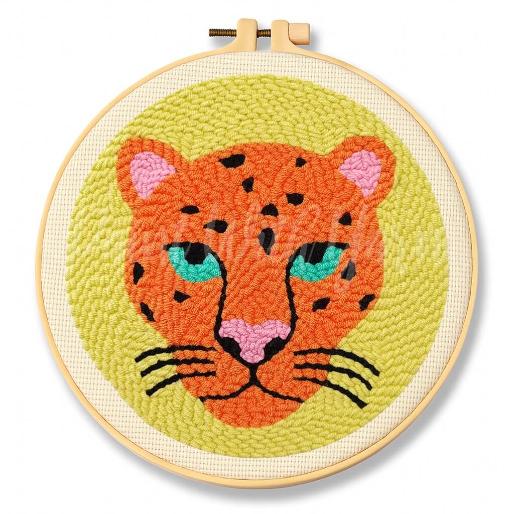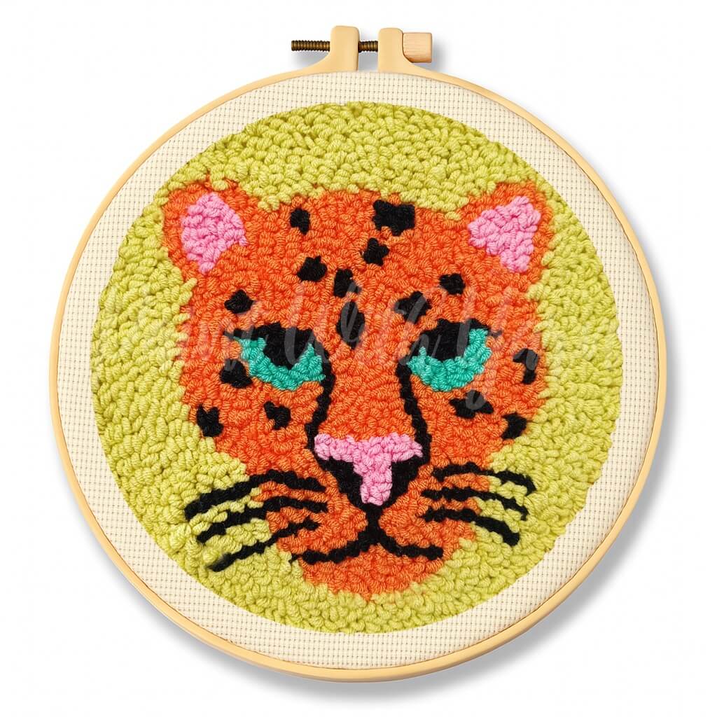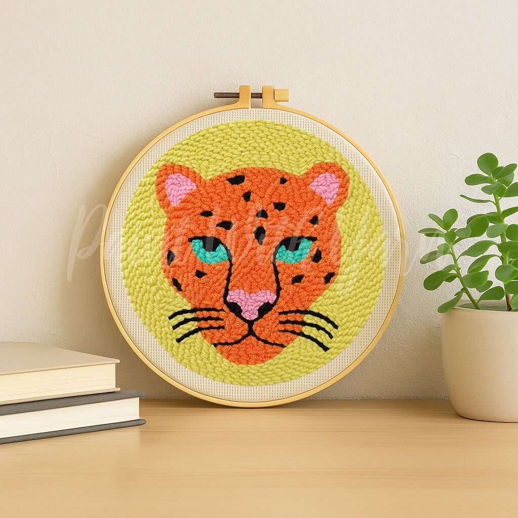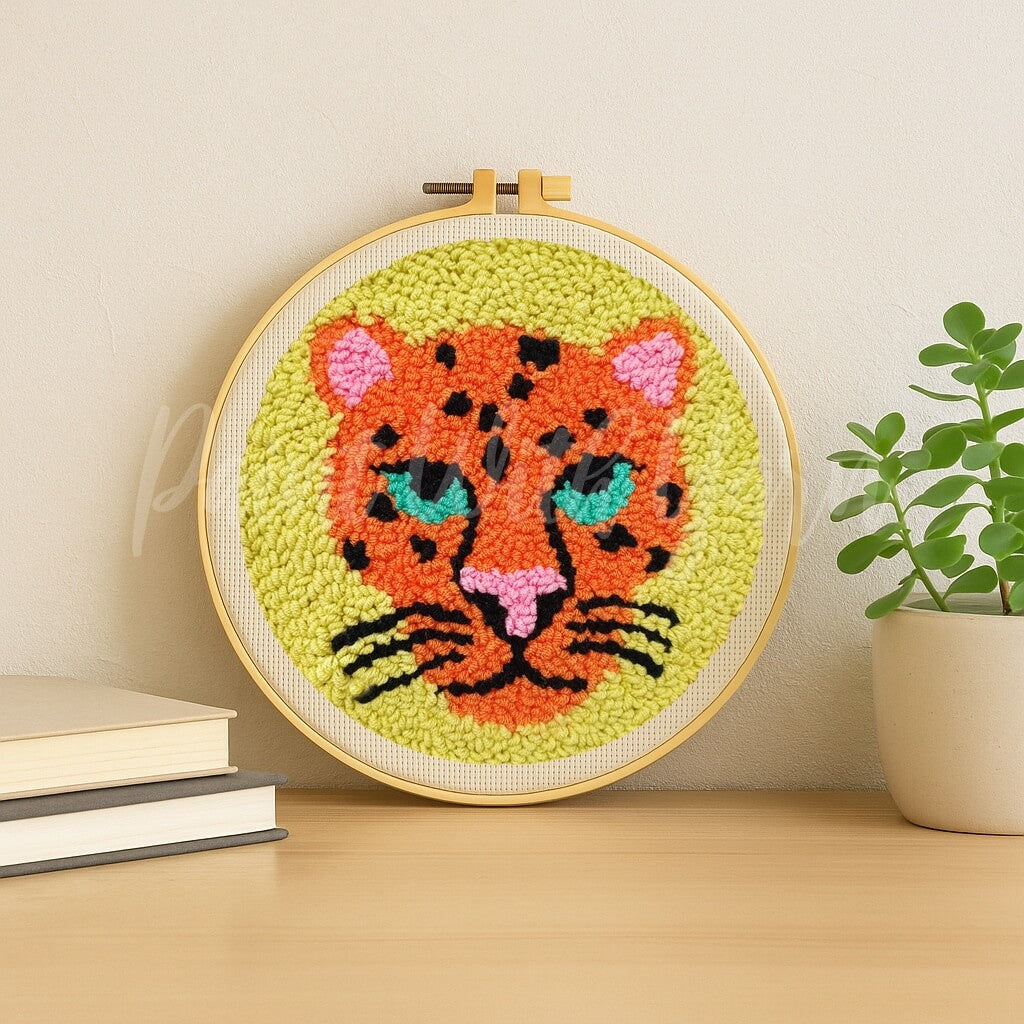 Unleash your wild side with our Jungle Leopard Punch Needle Kit. Featuring a striking orange leopard with vivid turquoise eyes and bold black spots, this design adds a fierce and vibrant touch to your space. Set against a bright jungle-green backdrop, the pattern is playful yet powerful—perfect for animal lovers and creative spirits alike. Whether you're new to punch needle or a seasoned stitcher, this kit brings bold character and color to your handmade decor.